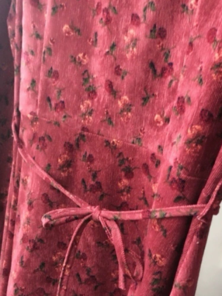 淡い赤のベースカラーに、細やかな薔薇のプリントがエレガントに広がり、レトロ感を演出します。ウエスト部分のリボンはフィット感を調整でき、スタイルアップ効果も抜群。