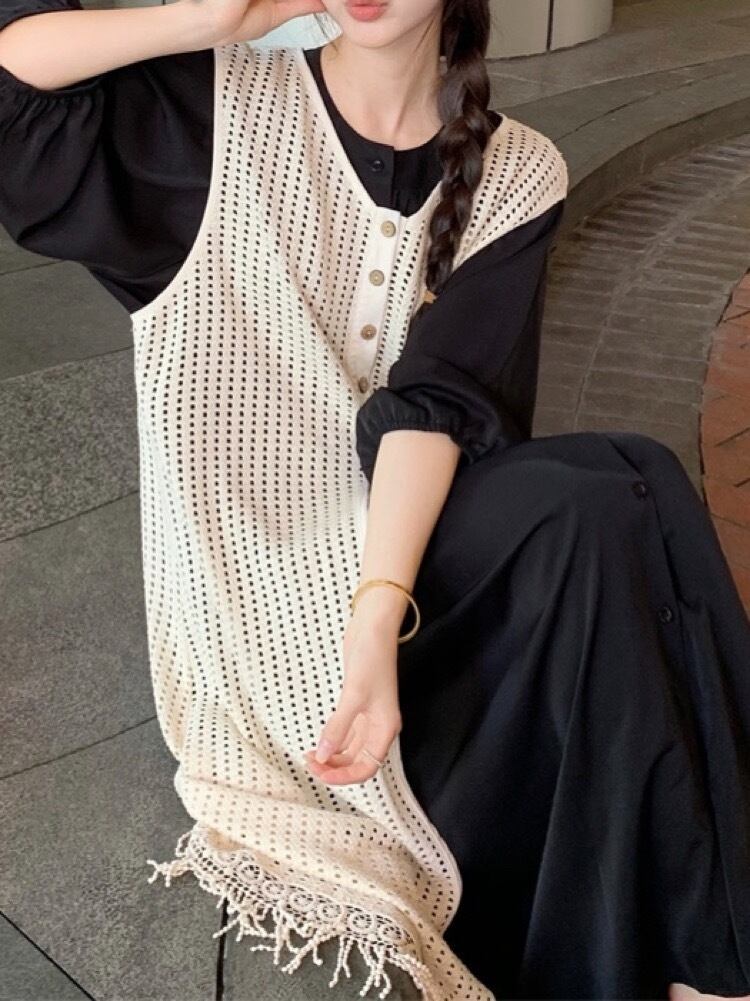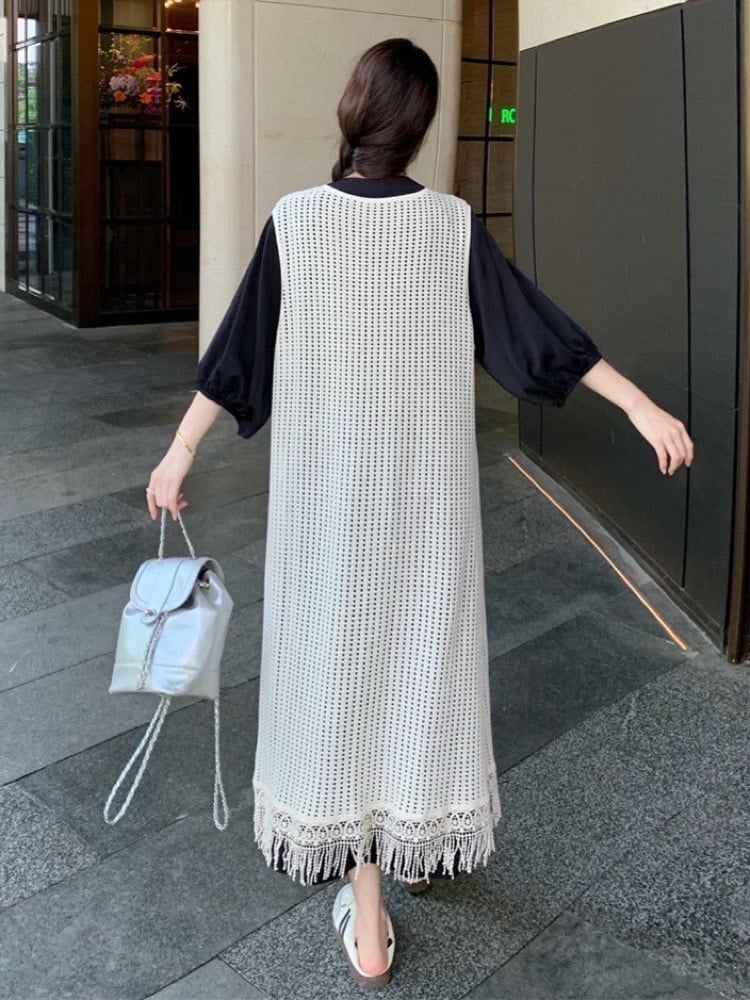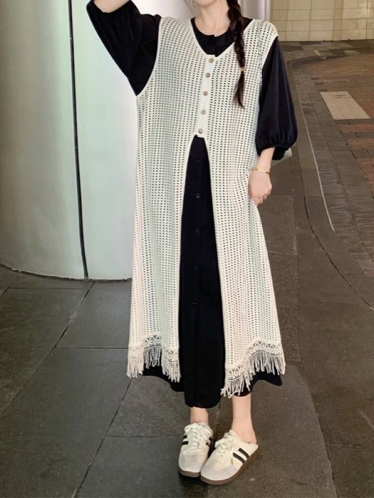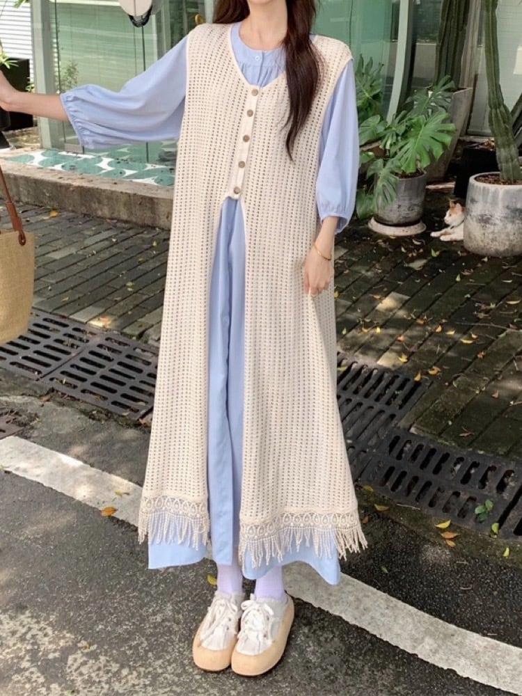リラックス感たっぷりの大人ナチュラルスタイル フリンジ付きニットベスト&シャツワンピースセット レイヤードコーデ 大きいサイズ 韓国 CH10010