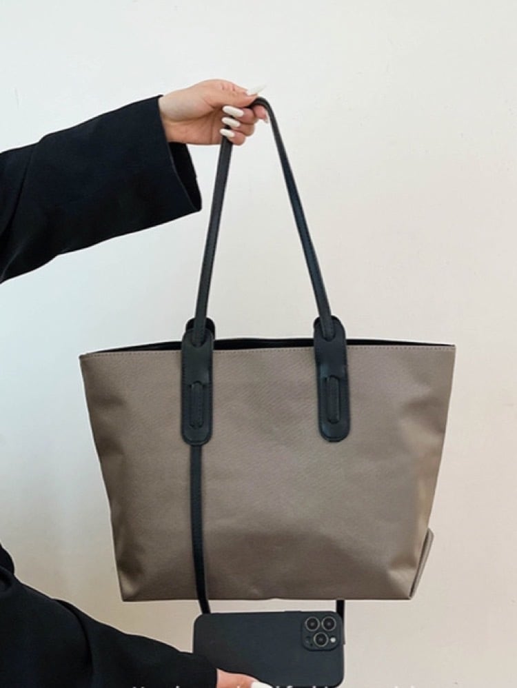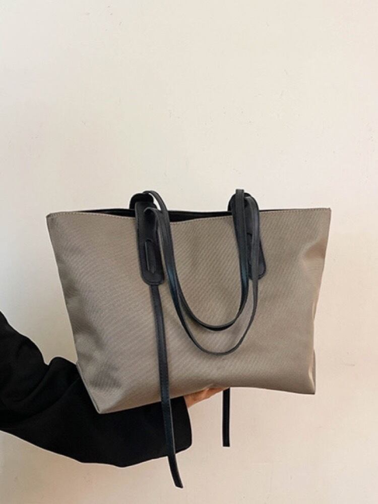 トレンド感溢れるシンプルでシックなトートバッグ。ブラックとグレージュのカラー展開で、落ち着いた大人の雰囲気を演出します。内部は収納スペースが広く、A4サイズの書類やタブレット、ちょっとした買い物の荷物まで楽々収納可能。丈夫で軽い素材を使用しているため、持ち運びも快適。普段使いからビジネスシーンまで、あらゆる場面で活躍します。