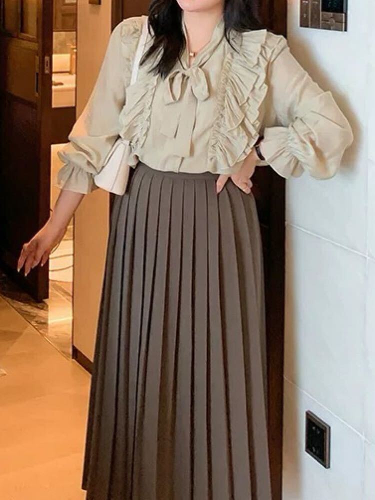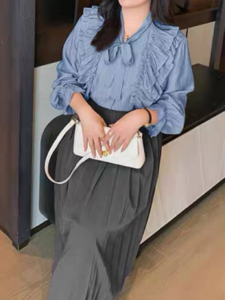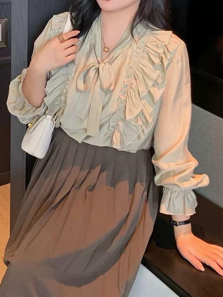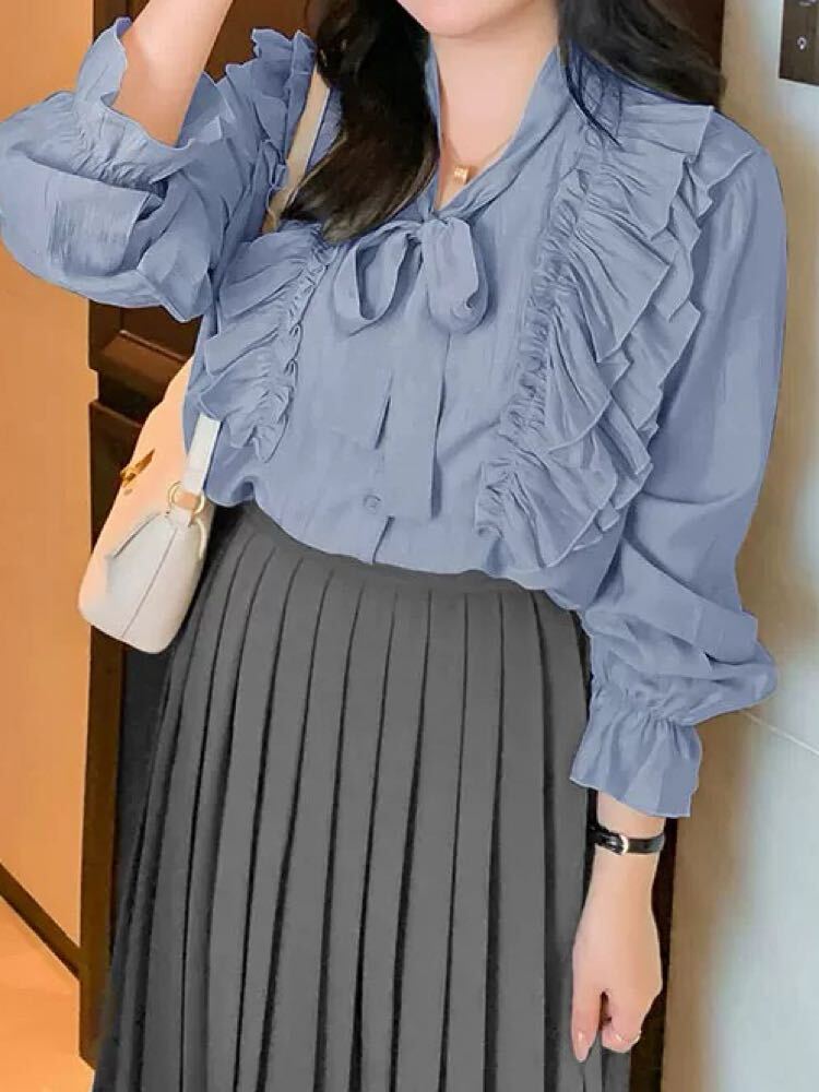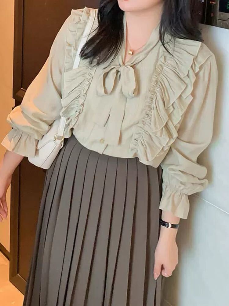 華やかでレディライクな仕上がり ワッシャーリボンタイフリルブラウス 長袖 フリル リボン お洒落 上品 清楚 オフィス カジュアル きれいめ フェミニン 体型カバー 大きいサイズ 韓国 CH9887
