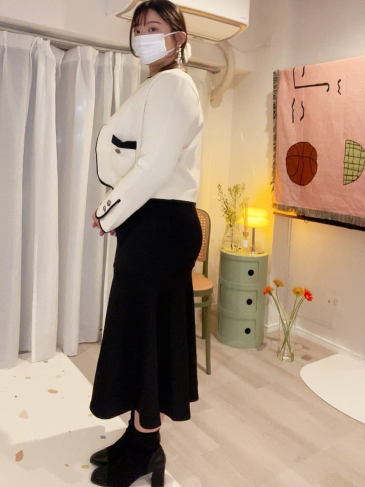 柔らかなシルエットながら、ジャケットの配色とブラックのワンピースでバランスの良い引き締まったスタイリングに。