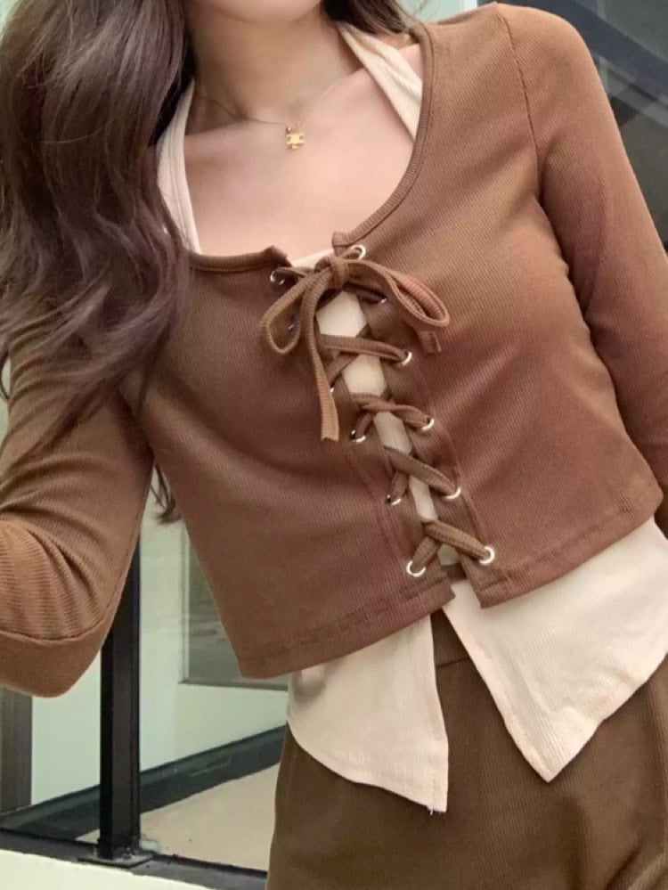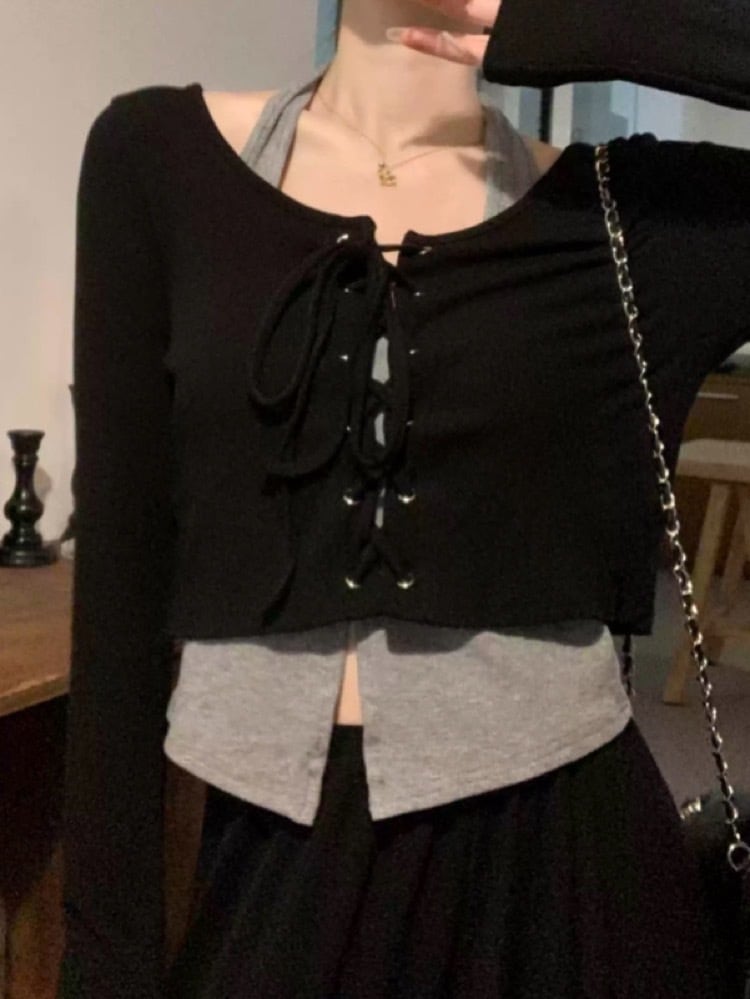 程よい甘さとシルエットで大人の抜け感コーデ 3点セット レースアップトップス× ホルターネックタンクトップ×ロングスカート 大きいサイズ 韓国 CH9945