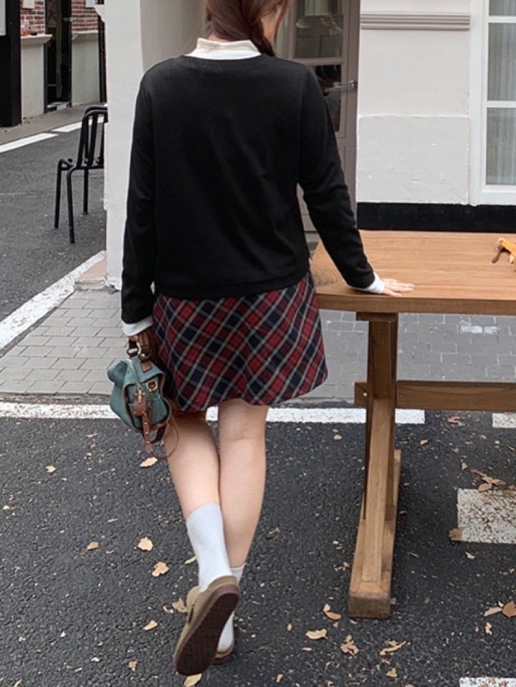 どこか懐かしさを感じさせる赤チェック柄のタイトミニスカート。