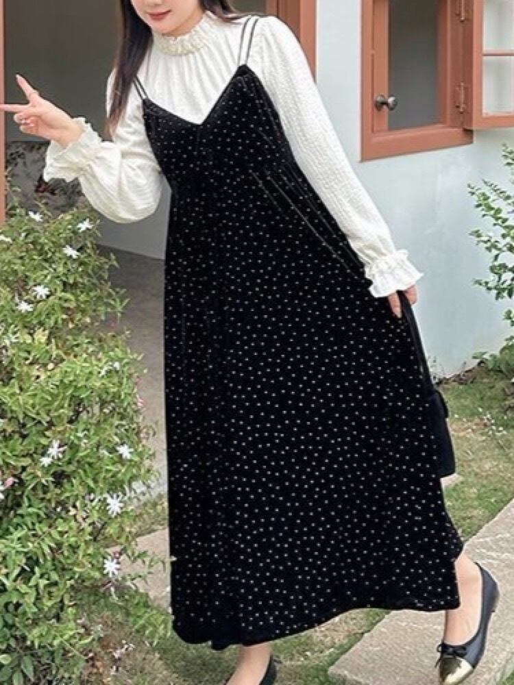 クラシカルなハイネックブラウスと、ドット柄キャミワンピースのセットアイテム。
