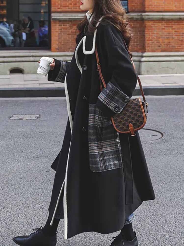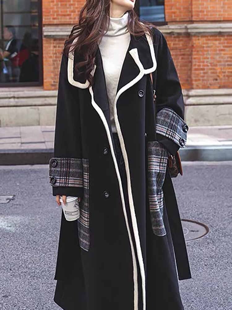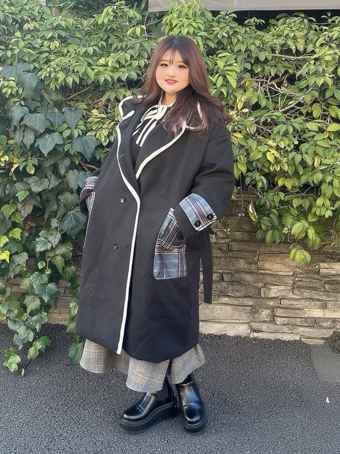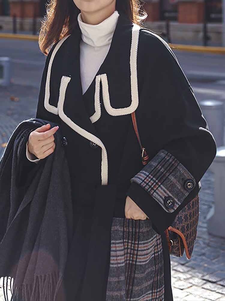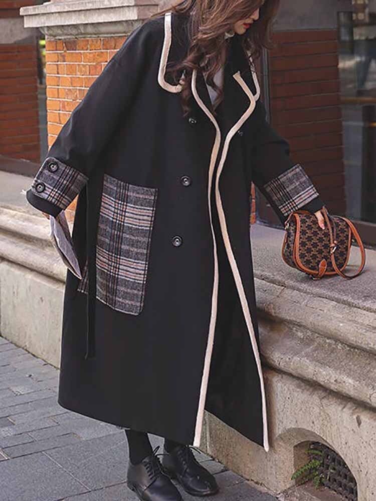 【即納】1点限定 チェック柄デザインダブルブレストロングコート 大人 かわいい おしゃれ バイカラー ロング アウター 大きいサイズ 韓国 CH8129