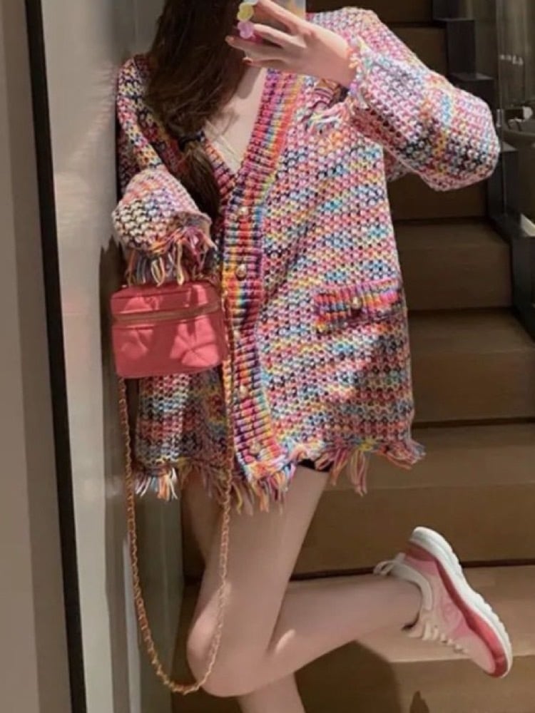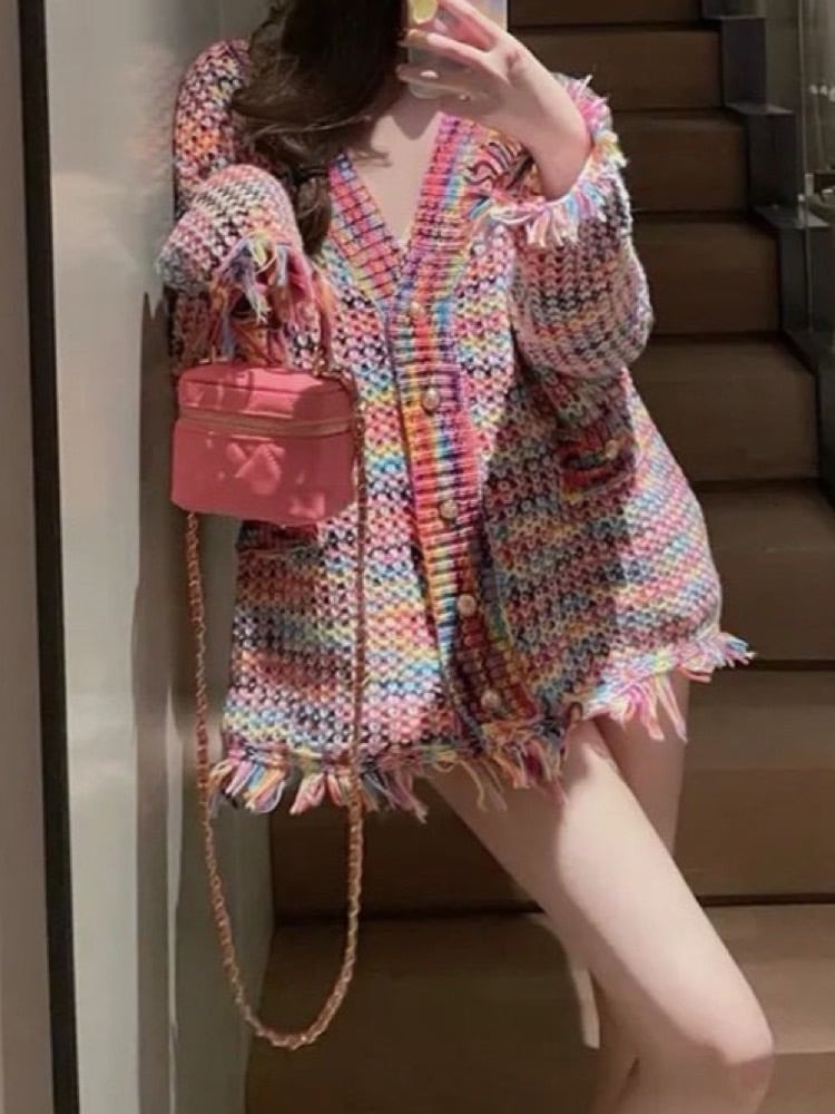 カラフルな糸とフリンジが目を引く、このカーディガンは、レトロとトレンドを絶妙に融合させた一着です。