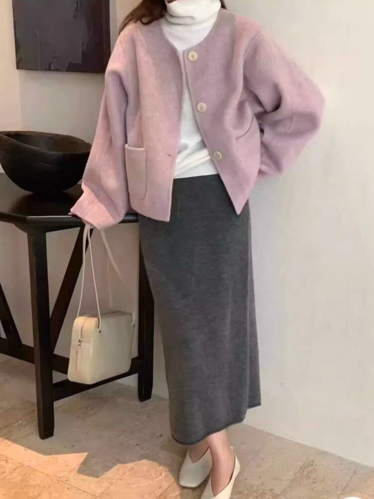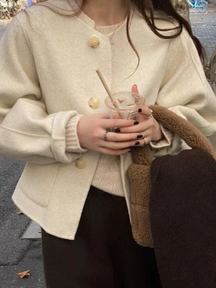女性らしいキュートな淡色と美シルエットが魅力的 ラウンドネックウールコート 秋冬 ショート丈 差し色 大人かわいい おしゃれ カジュアル きれいめ フェミニン オフィス 通勤 お出かけ 体型カバー 大きいサイズ 韓国 CH10167