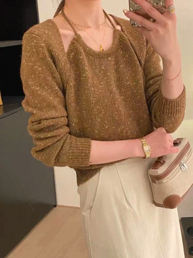 ホルターネックの風のディテールが目を引く、レイヤード風ニット。