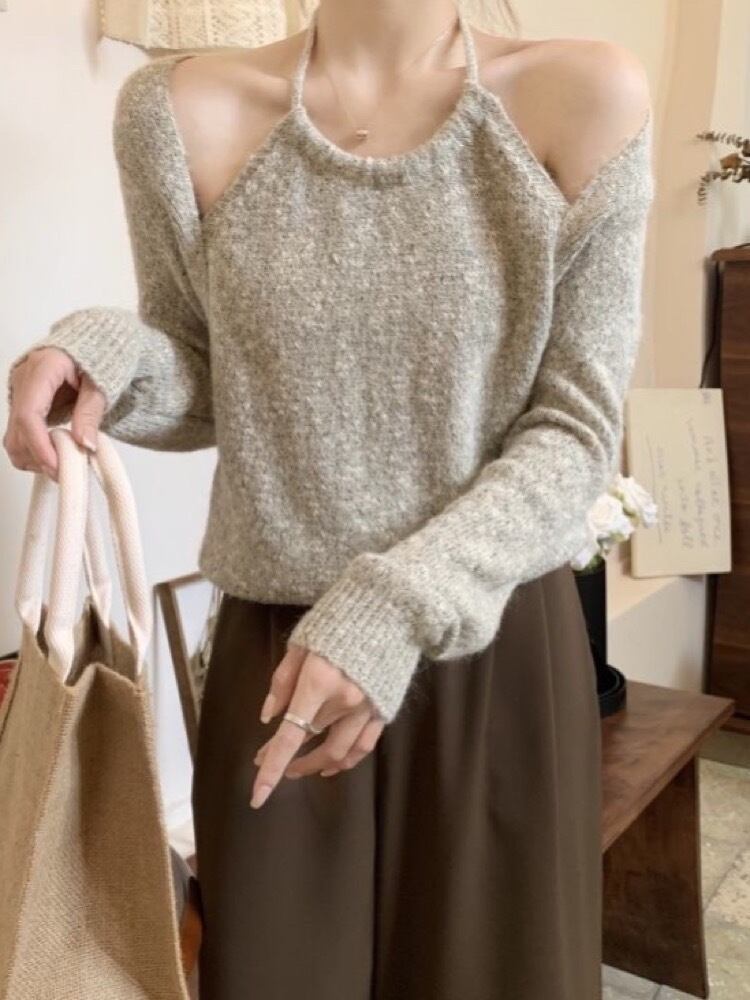さりげなく肌見せで魅せる ホルター付きオープンショルダーニット 大人かわいい おしゃれ カジュアル きれいめ フェミニン オフィス 通勤 お出かけ 体型カバー 大きいサイズ 韓国 CH10141