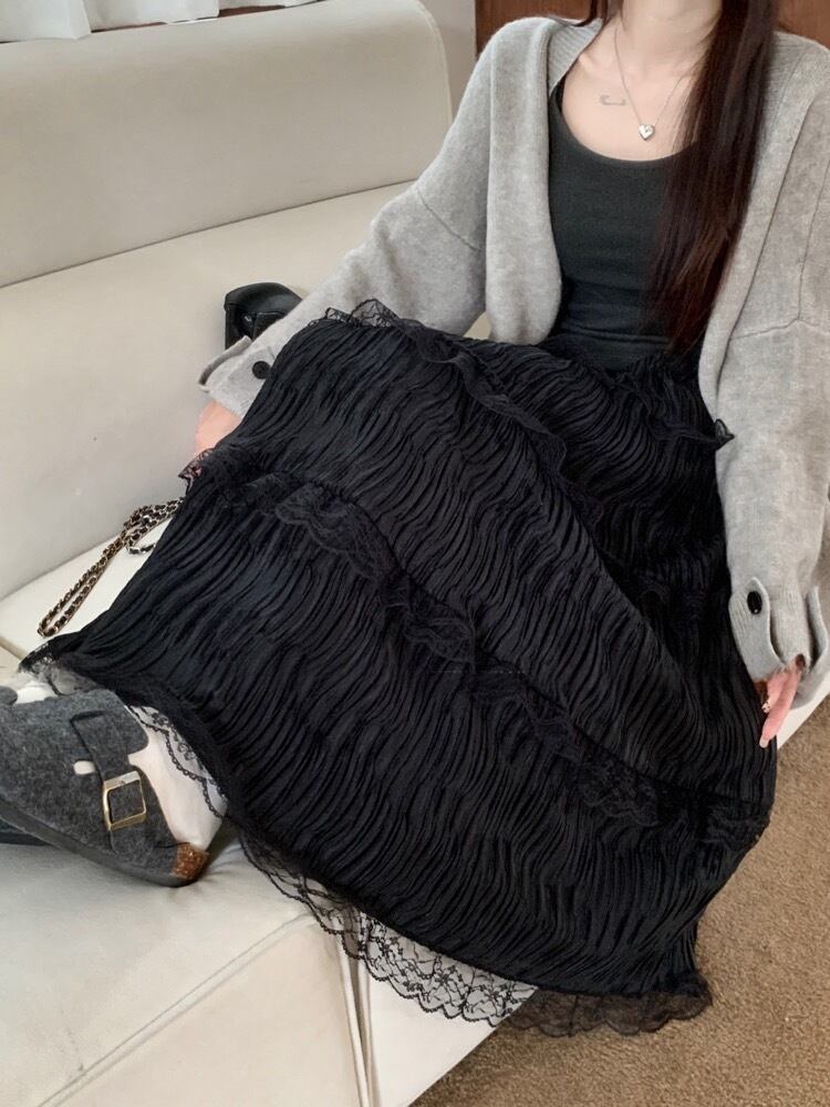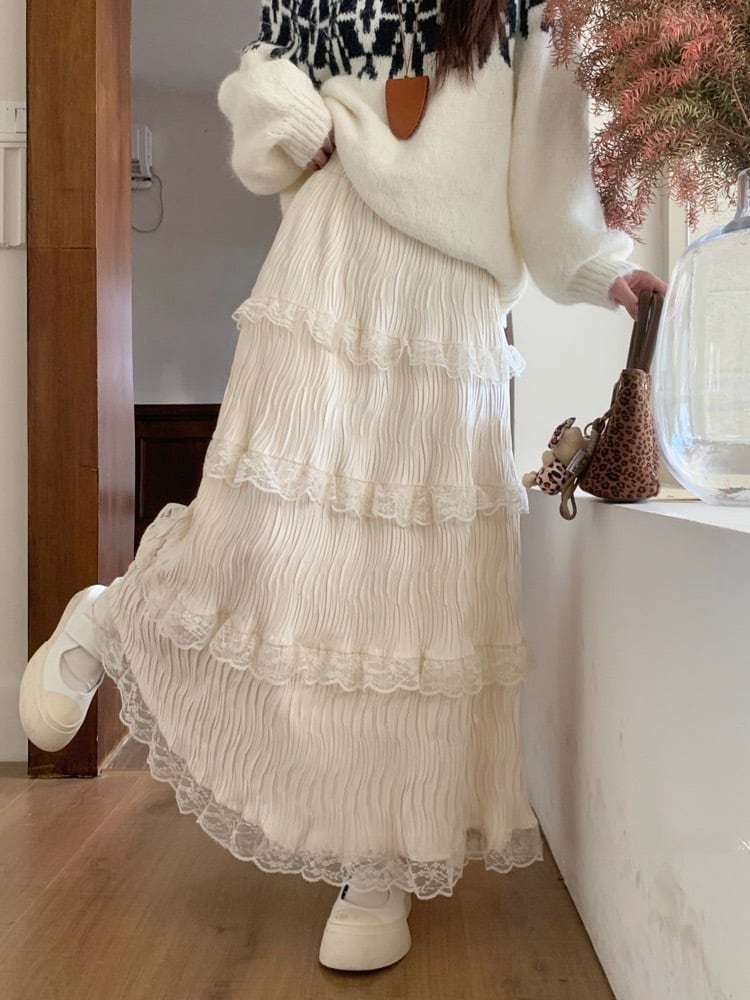 歩くたびにふわりと揺れる レースティアードスカート レース ロングスカート プリーツ ふんわりシルエット フェミニン 大きいサイズ 韓国 CH10366