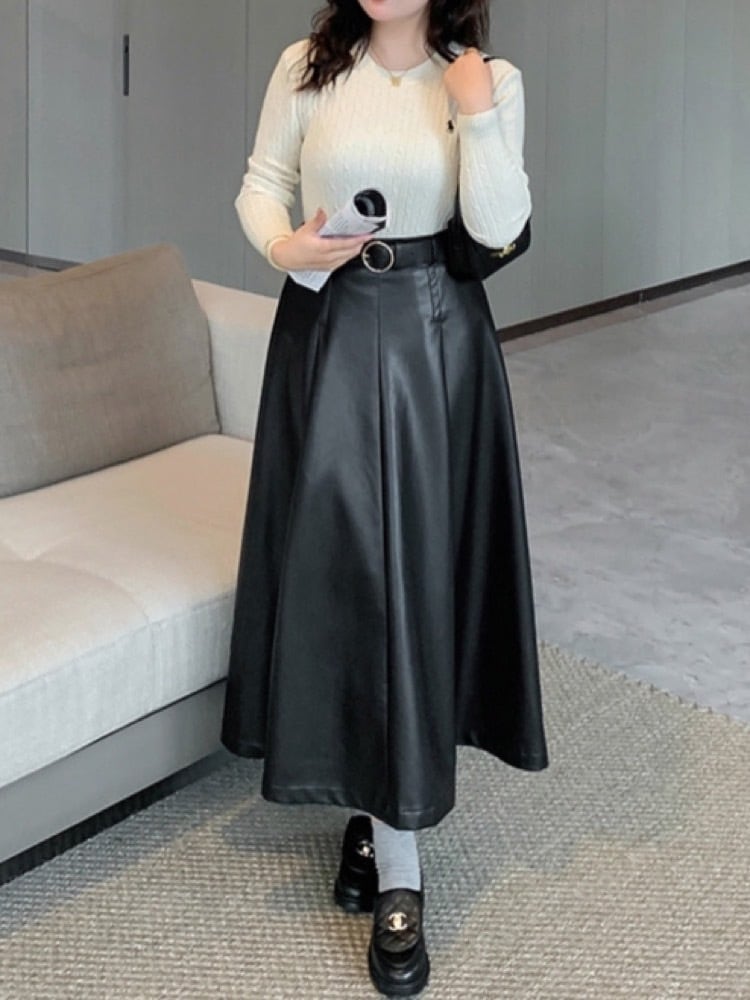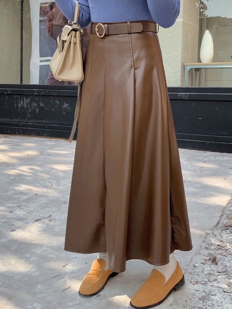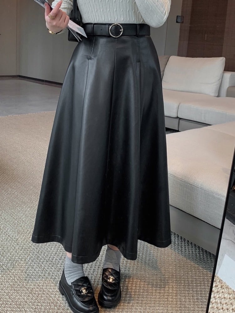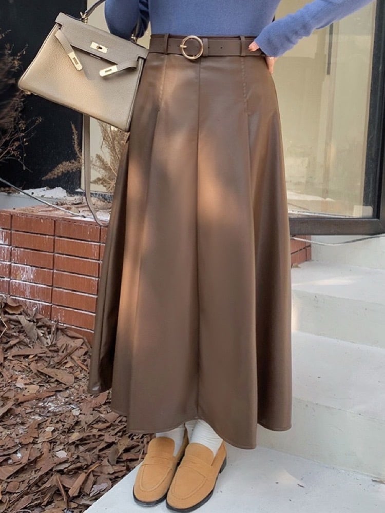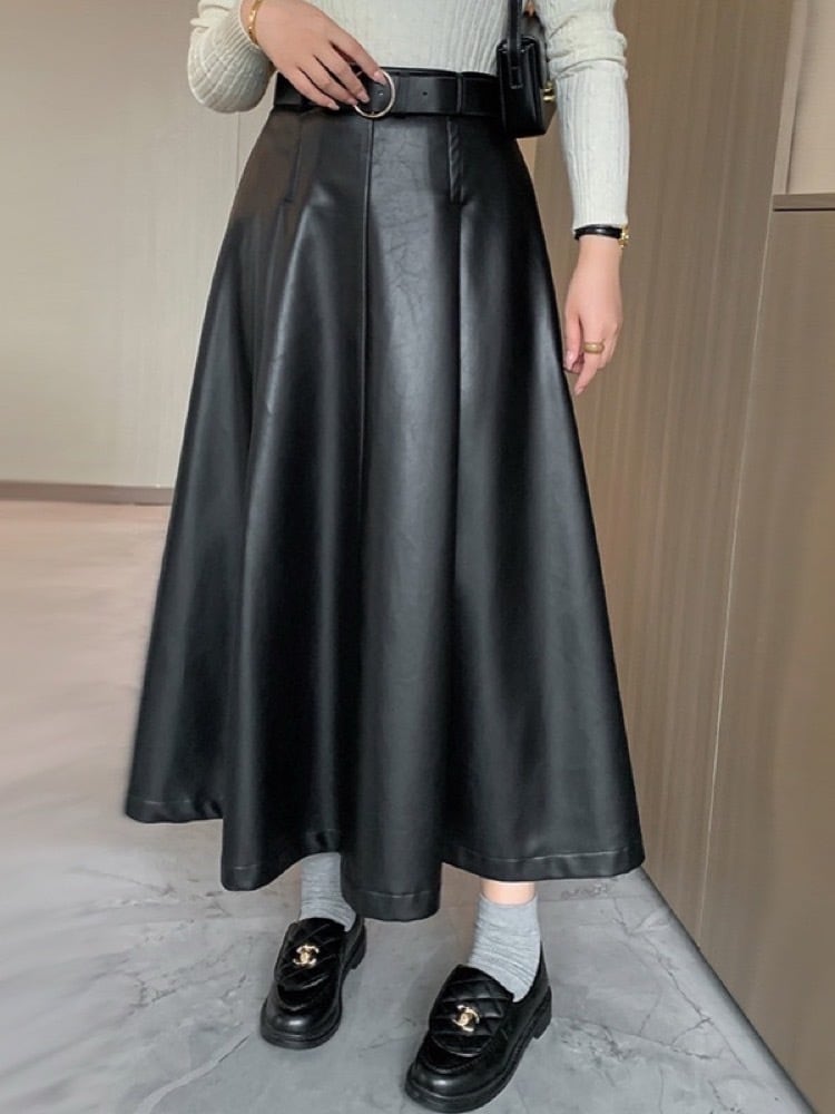 軽やかに揺れる上品シルエット フェイクレザーロングスカート ベルト付き Aライン スタイリッシュ 大人カジュアル 大きいサイズ 韓国 CH10342